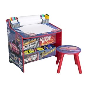 The cars art table is an all in one station for fun featuring your child's favorite cars characters. The art desk is perfectly sized for your little one and features a wipeboard desktop with two small stores cups perfect for holding pens, pencils and crayons. Includes one paper roll for coloring and drawing (fits any standard size paper roll). Four medium sized storage bins sit underneath the desktop and provide ample storage space for toys, art supplies, games and more. Stool is included. Makes a great gift and coordinates perfectly with other cars items sold seperatley online. Some assembly is required.